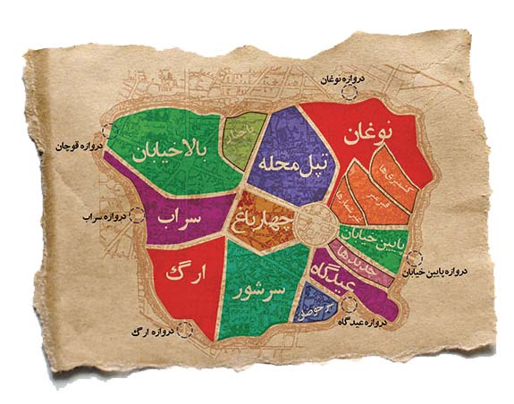 در این نقشه نیز نام محلات و دروازه های شش گانه شهر مشخص شده است.