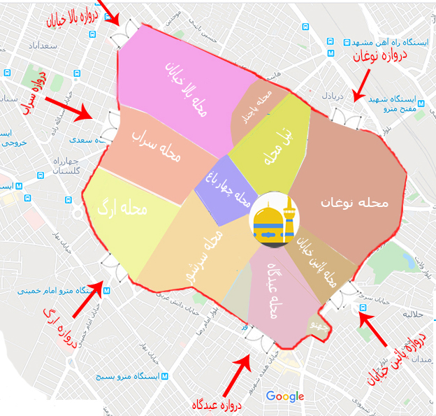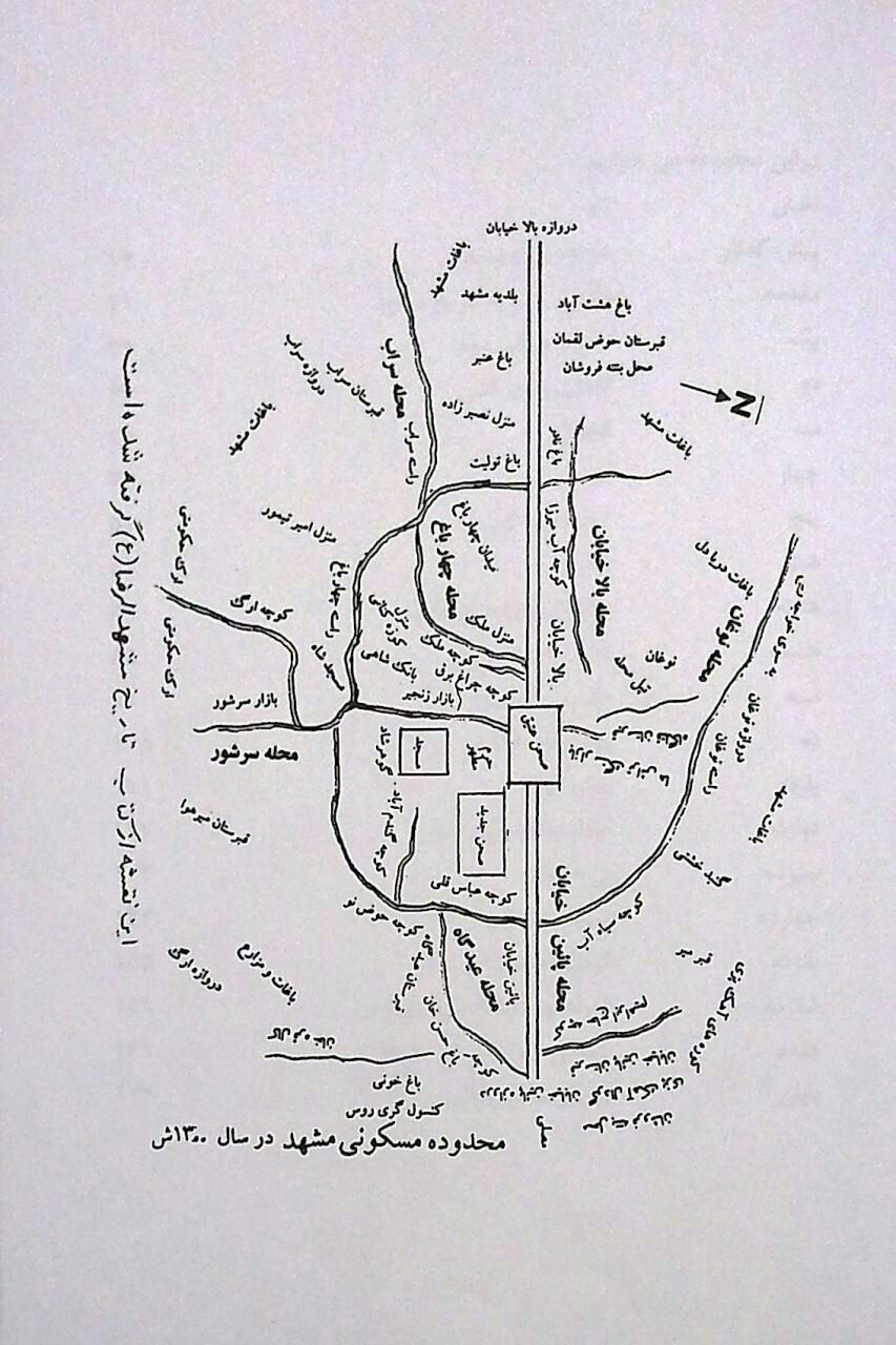 در این نقشه نام و محل دروازه ها و محلات شهر مشهد تا پایان دوره قاجار مشخص شده است