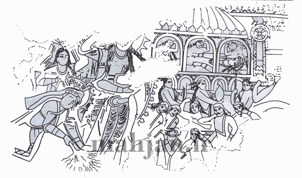 سیاوش نشسته بر اسبی سیاه در حال کشیدن کمان