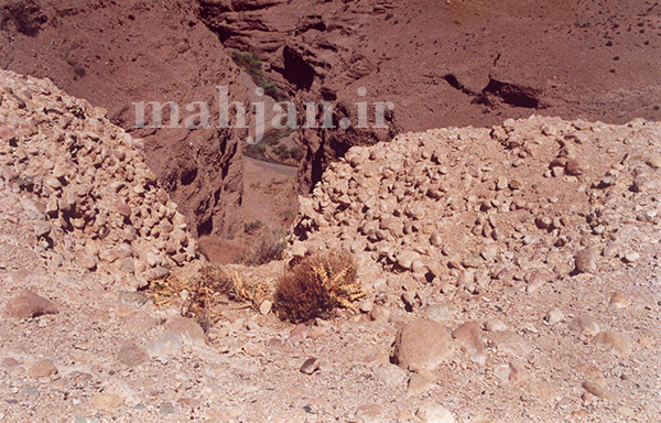 نمایی عمومی از بند زو و حجم بزرگی از سنگ های فروریخته از دیواره ی بند. این بند از ساروج و لاشه سنگ ساخته شده است
