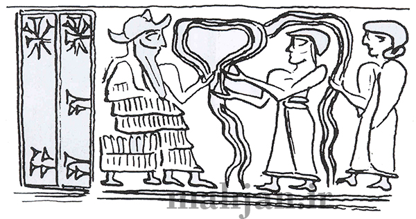 در این نقش شامل دو رب النوع زن و مرد در میان پرستندگان ( خادمان ) خود نشسته¬اند. این خدا تاجی شاخ¬دار بر سر دارد و روی یک مار حلقه زده نشسته است. سر مار را در دست چپ دارد، و با دست راست ظرفی را گرفته که آب از درون آن فواره می¬زند. سه نفر در سمت راست و دو نفر در سمت چپ با لباس-های بلند ایستاده¬اند. چندین نفر در مقابل ایشان با لباس¬های کوتاه و دست بسته روی تخته سنگ¬های جداگانه¬ای حجاری شده¬اند. این نقش برجسته به اواخر هزاره سوم پیش از میلاد تعلق دارد و طبق کاوش¬های باستان شناسی متعلق به یکی از پرستشگاه¬های ایلامی است.