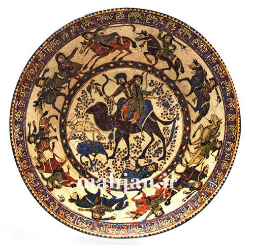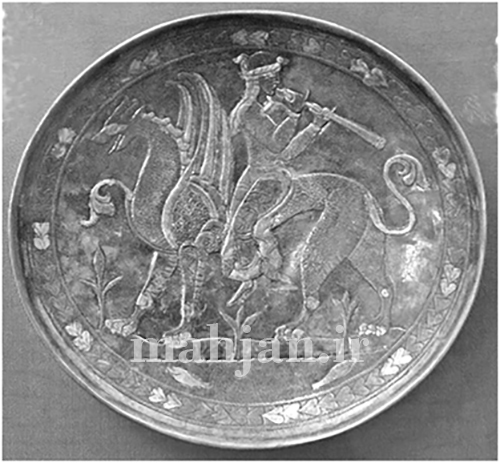 بشقابی سیمین از دوره ی ساسانی، نگاره ی حکاکی شده بر روی آن مردی را نشان می دهد که صورت خود را سیاه کرده است و به صورت پشت و رو بر چهارپایی بالدار  نشسته و در سُرنا می دمد. گیاهان درحال رویش هستند و وجود دو ماهی در پایین نگاره نشانگر ماه حوت یا اسفند یا آغاز بهار است. (این بشقاب در موزه ارمیتاژ نگهداری می شود)